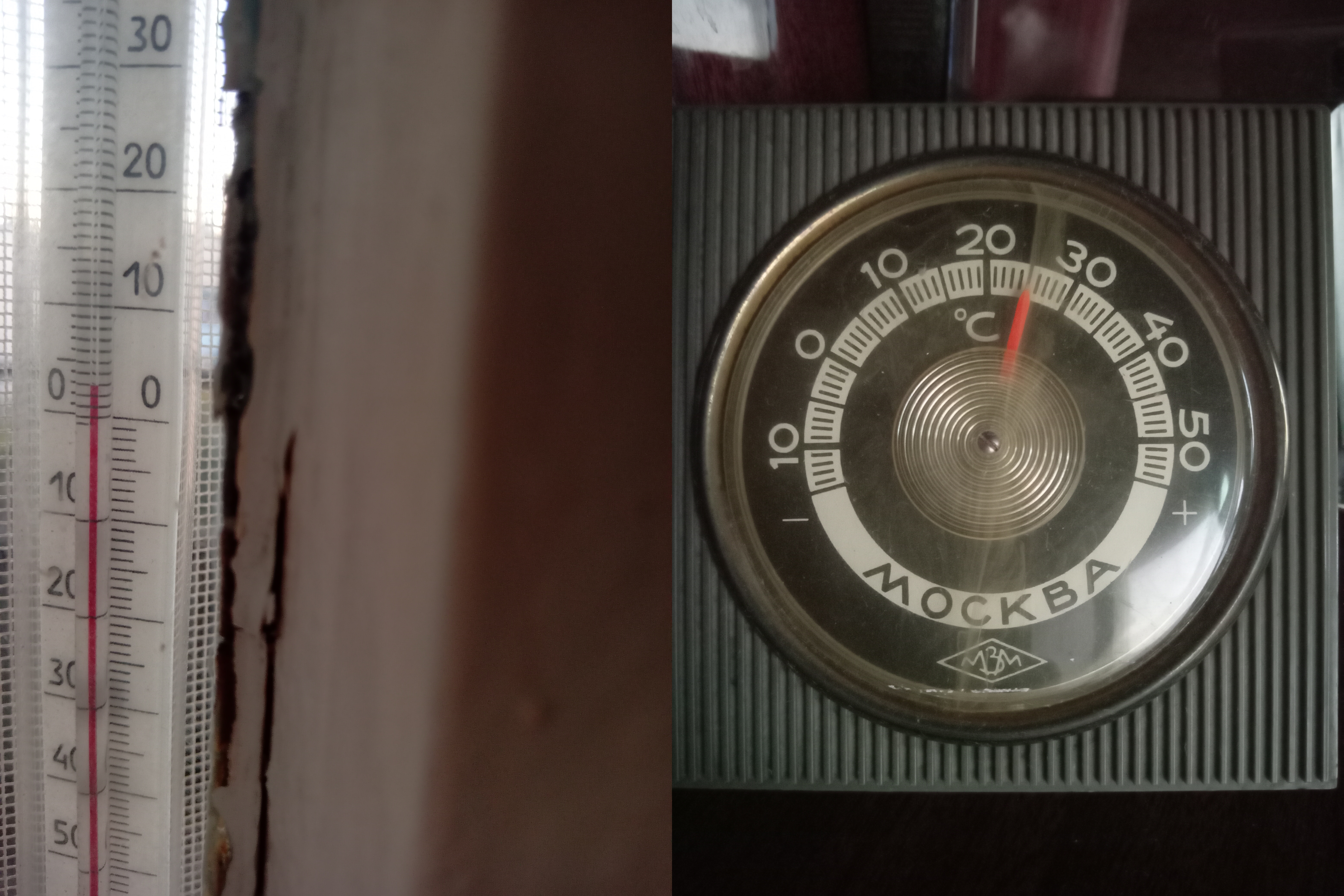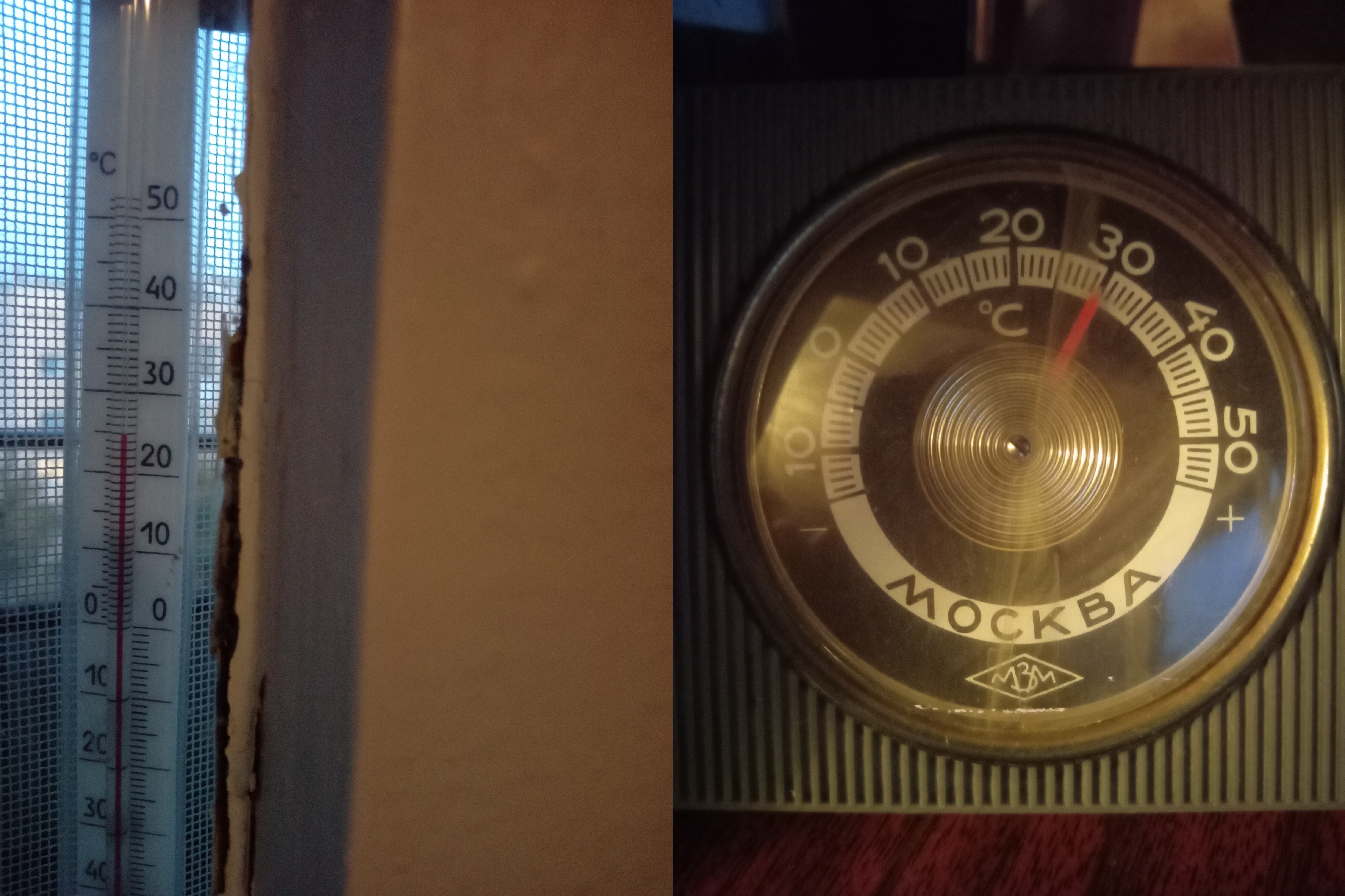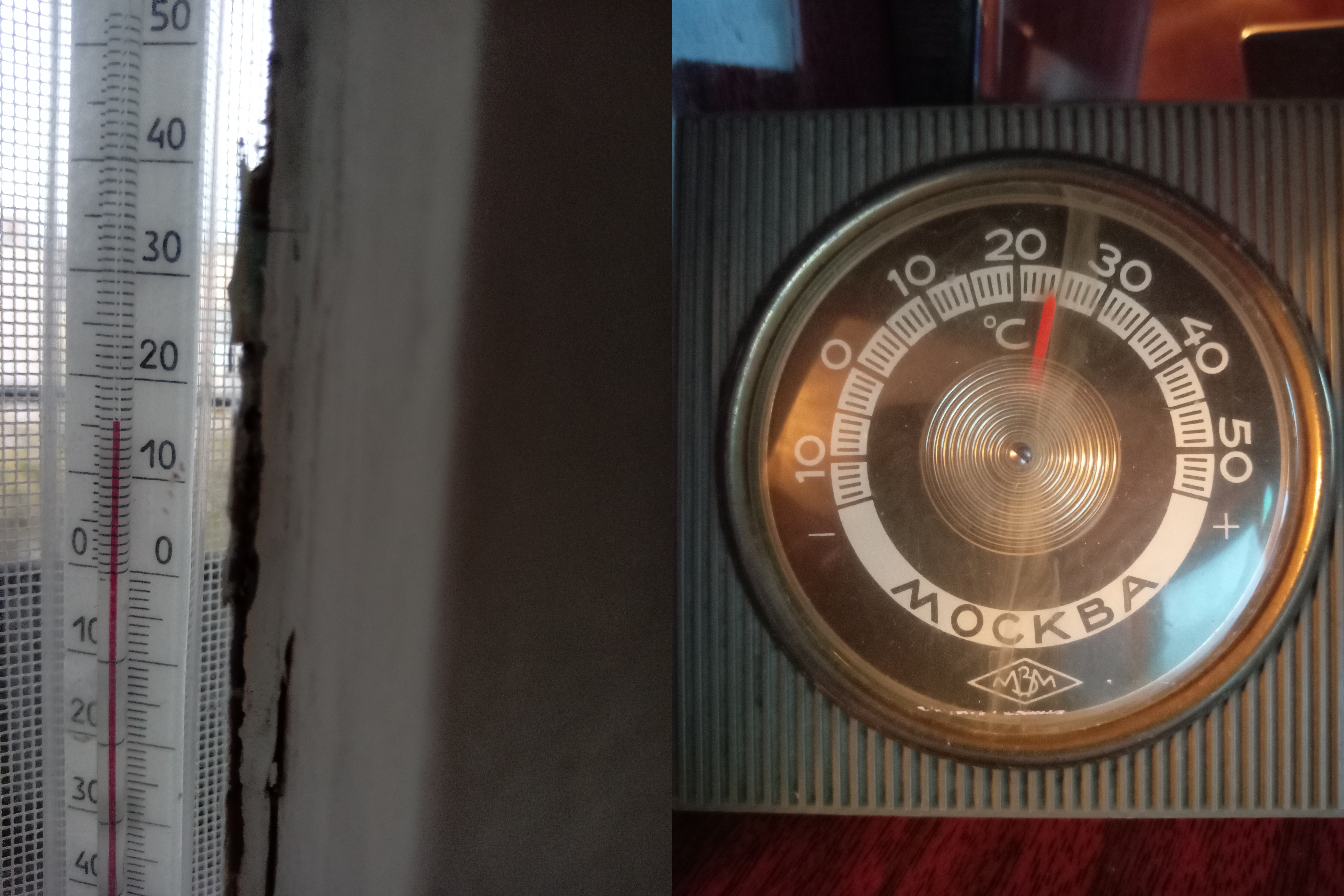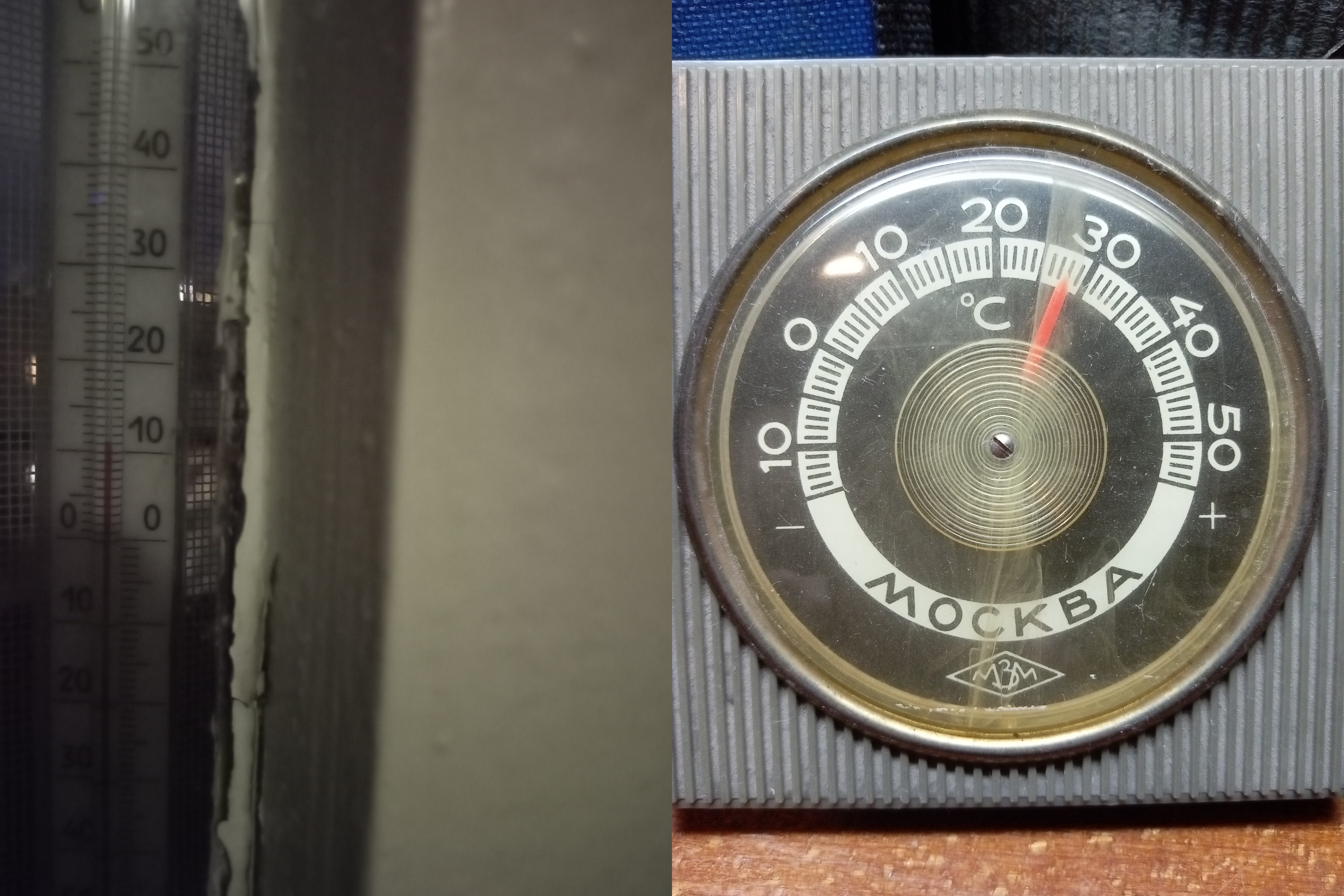 До Нового года зима так и не началась. Слева — уличный термометр, справа — комнатный