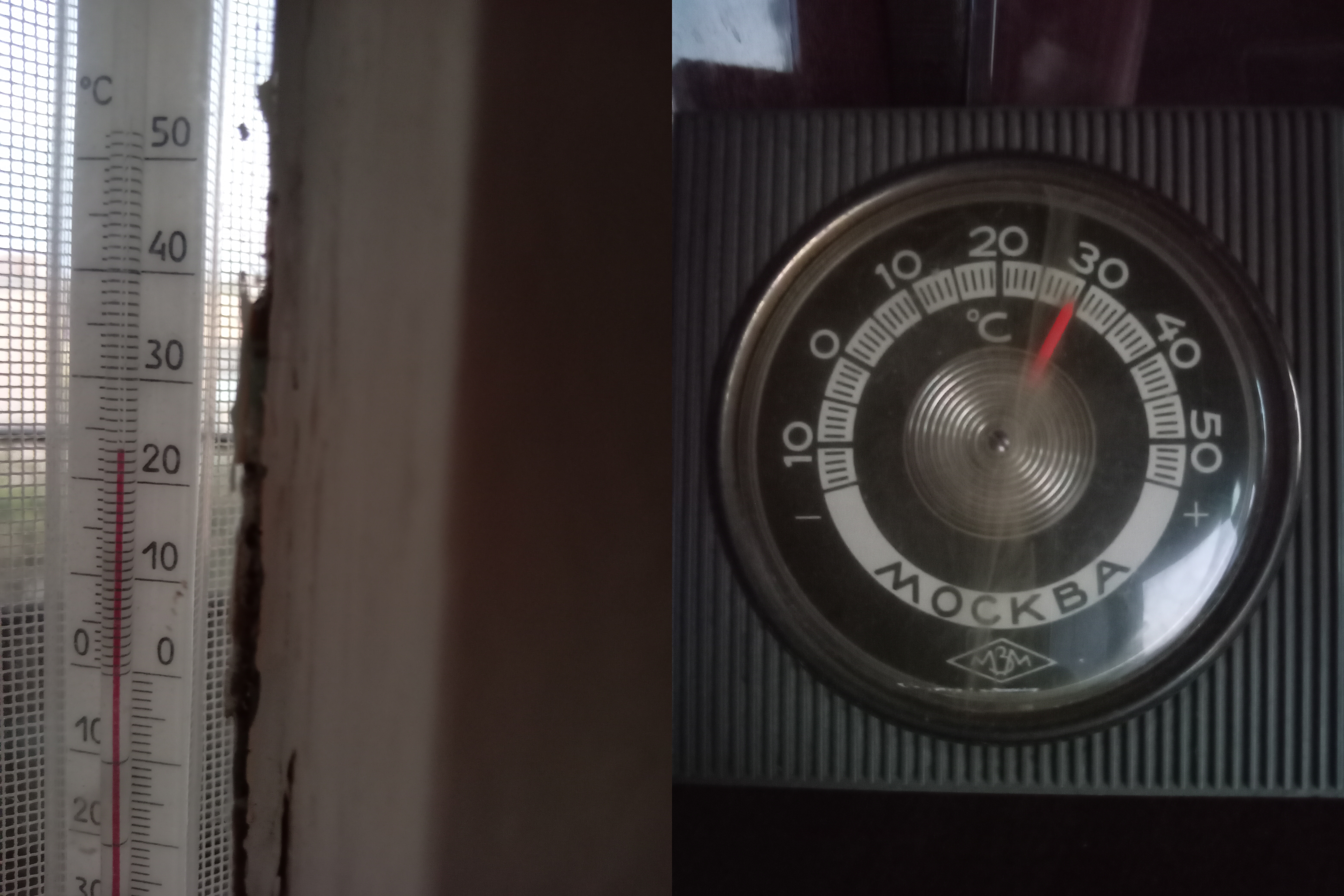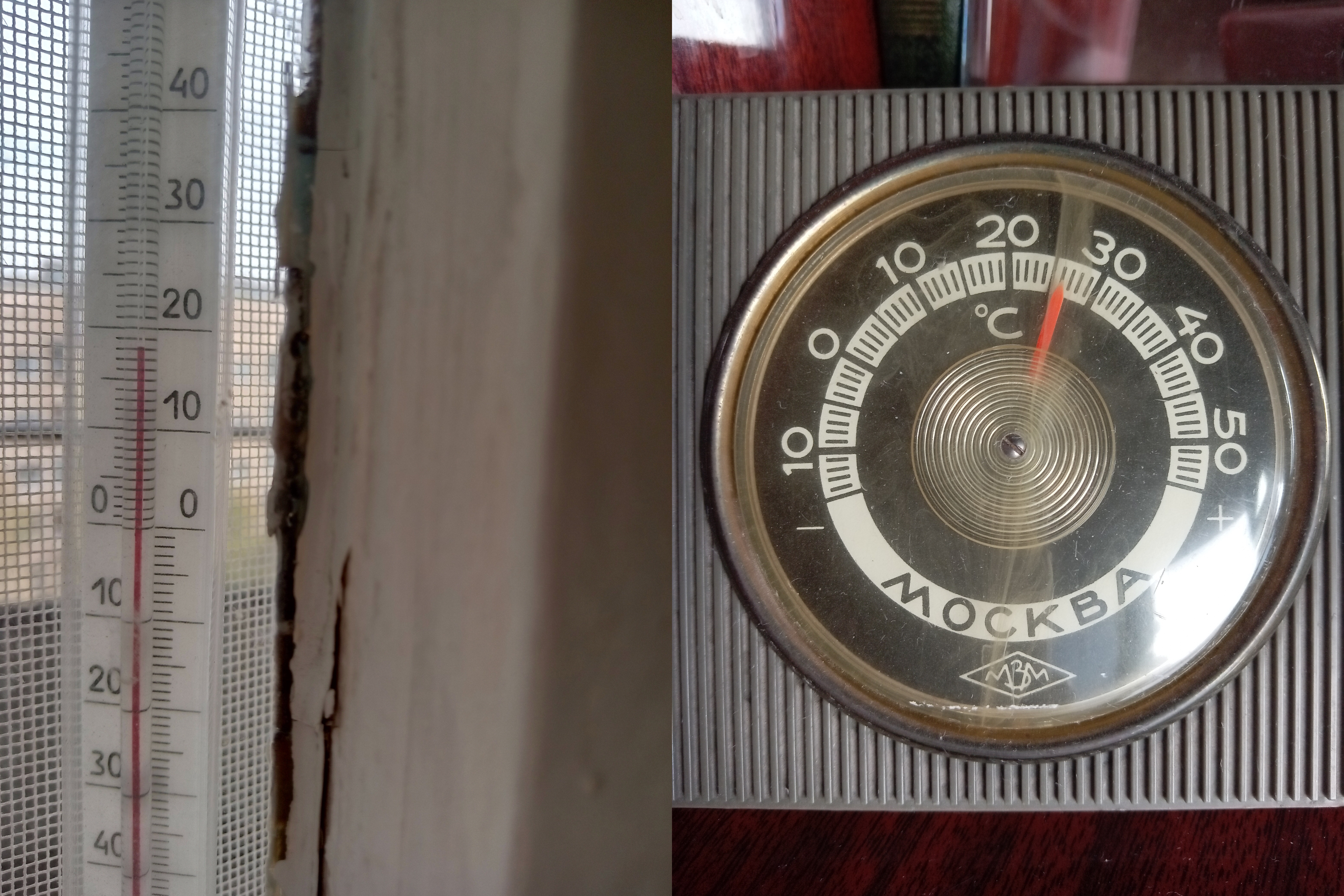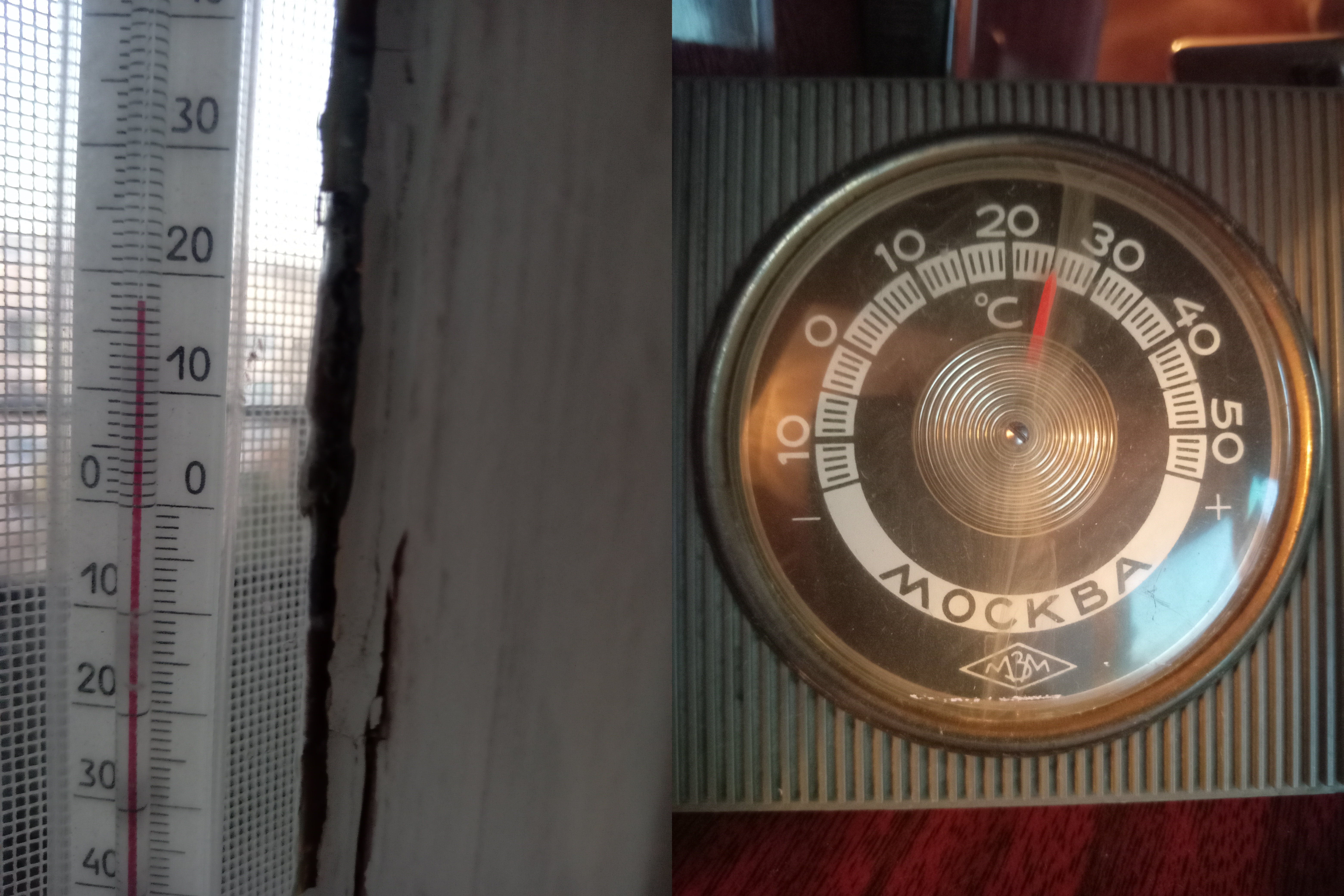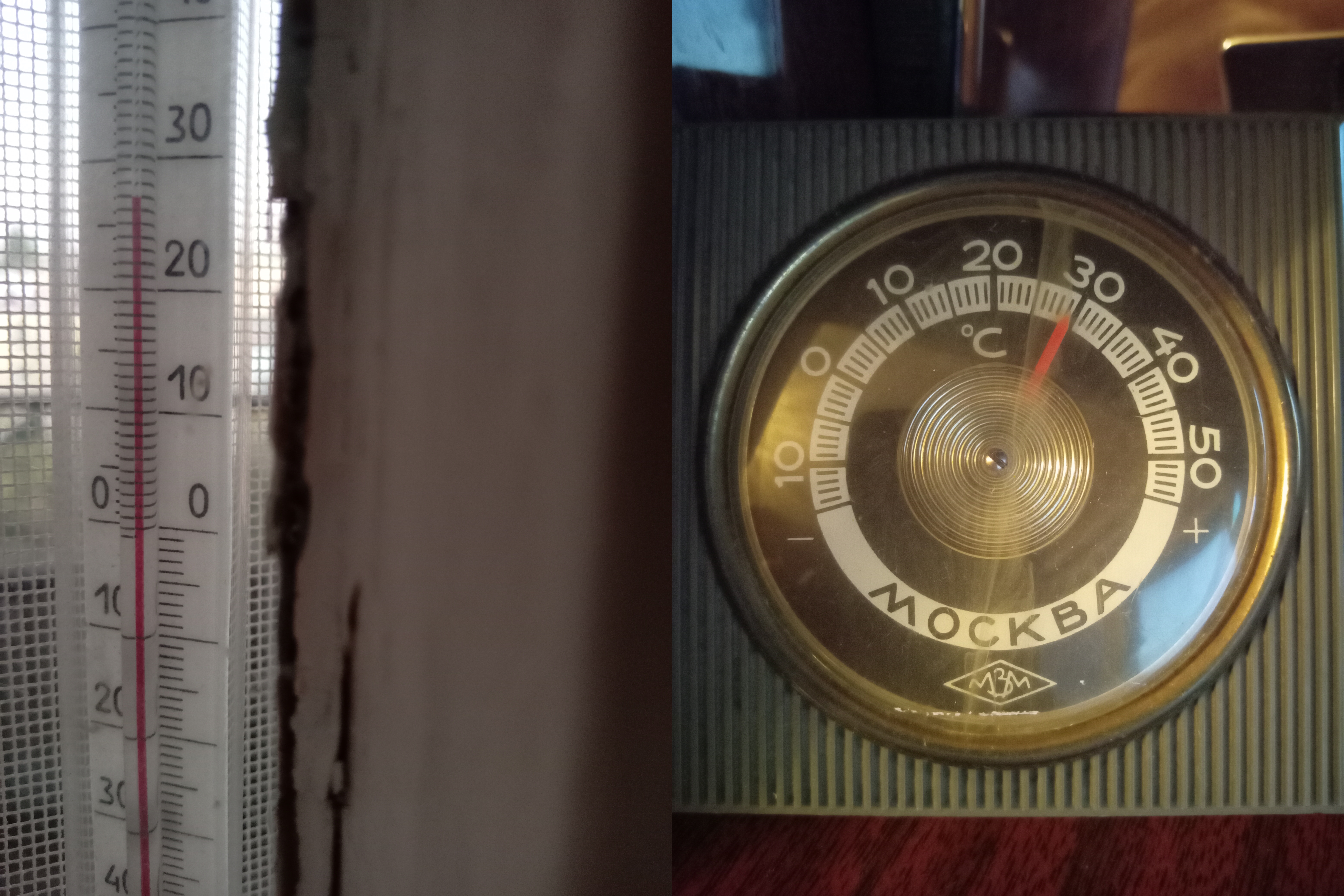 До Нового года зима так и не началась. Слева — уличный термометр, справа — комнатный